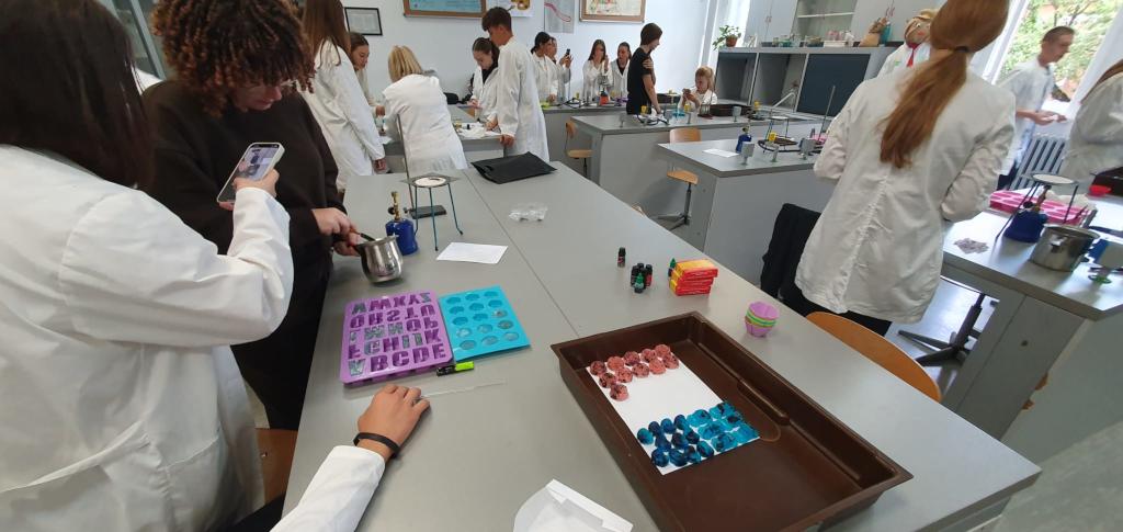 Učenici su posjetiteljima sajma pokazali izradu prirodnih sapuna i šumećih kugli za kupanje, uz mentorstvo profesorice kemije Ankice Fusić i profesora biologije Damira Maretića.