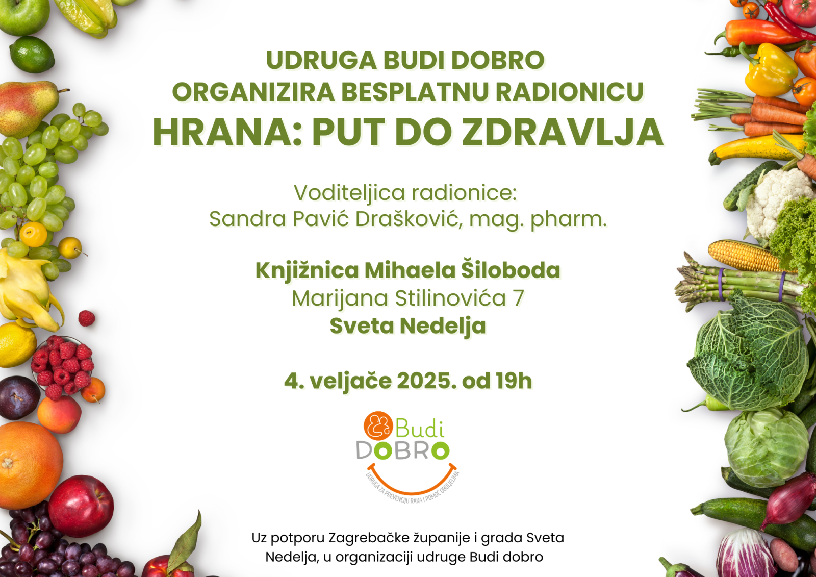 Udruga Budi dobro poziva vas na besplatnu radionicu "Hrana: put do zdravlja", koja će se održati 4. veljače 2025. u 19 sati u Knjižnici Mihaela Šiloboda u Svetoj Nedelji.