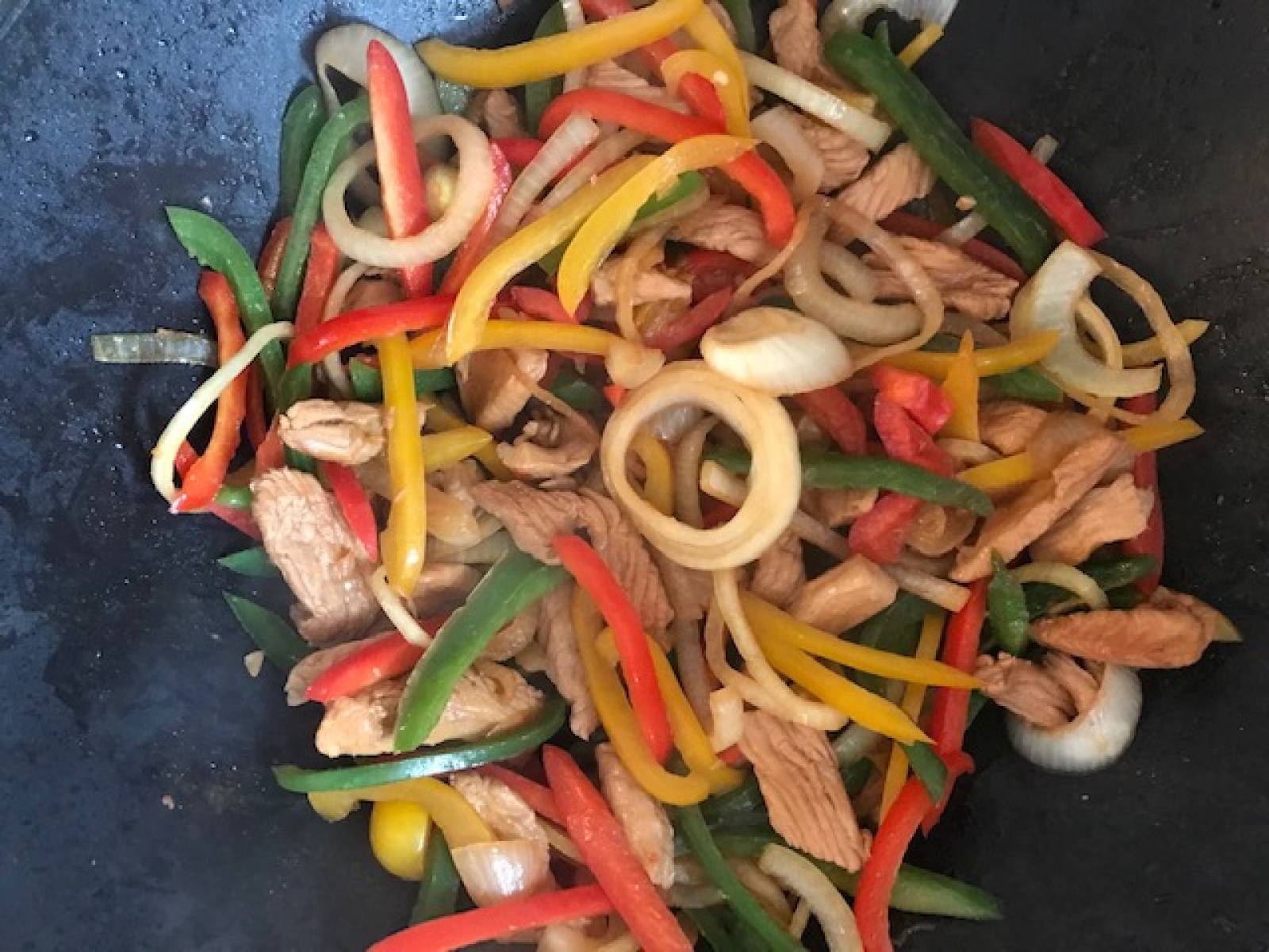 Skuhajte špagete, procijedite, isperite vodom i dodajte malo ulja da se ne zalijepe. Pureća prsa i povrće narežite na trakice. Luk na tanke kolutove. Meso koje ste prethodno kratko pacali u 3-4 žlice soja sosa prepecite u voku i rasporedite po rubovima tave. U sredinu dodajte luk i kratko dinstajte. Na sve dodajte ostalo povrće. Dobro promiješajte i kratko pržite da ostane hrskavo, cc 10-ak minuta. Na kraju umiješajte kuhane špagete, soja sos prema želji, soli i papra. Umjesto špageta povrće možete poslužiti uz integralnu rižu.
